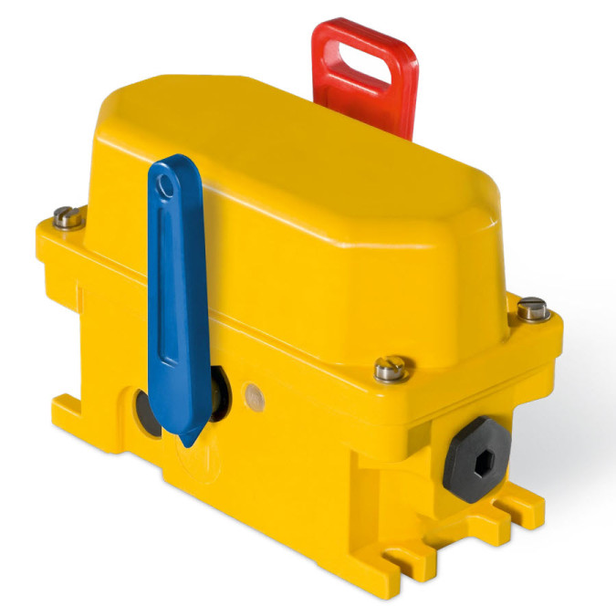 Kiepe SEG 005 - це аварійний тросовий вимикач, призначений для використання на стрічкових конвеєрах як додатковий пристрій безпеки для екстреної зупинки обладнання. Трос симетрично натягується з обох боків червоного важеля, що дозволяє активувати аварійну зупинку на відстані до 2×125 метрів від кожного вимикача. Пристрій виконаний у алюмінієвому корпусі з можливістю встановлення до трьох нормально-відкритих та нормально-закритих контактів, які перемикаються одночасно за допомогою пружинного кулачкового диска з функцією миттєвого спрацювання. Вимикач підходить для зовнішнього використання та роботи при значних коливаннях температури навколишнього середовища. Після спрацювання аварійної зупинки механізм блокується в положенні "0", а для повернення в робочий стан необхідно вручну перевести синій важіль скидання в положення "1", що підготує конвеєр до наступного запуску. При цьому важливо, що саме скидання вимикача не повинно викликати автоматичний запуск системи, забезпечуючи додатковий рівень безпеки.